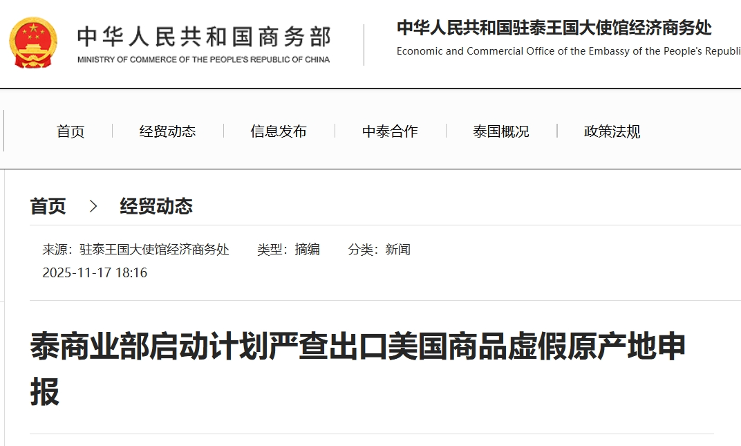 2025.11月:泰商业部宣布将打击对美出口中的虚假原产地申报行为,以应对美国自2025年7月31日起对泰国商品征收的19%关税。若查出通过转口伪造原产地的货物,征收关税最高可达40%,待提交内阁最终审议